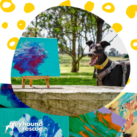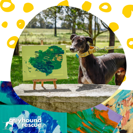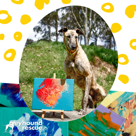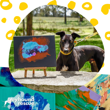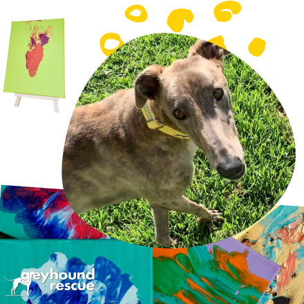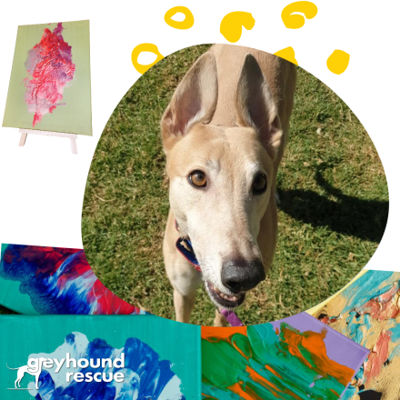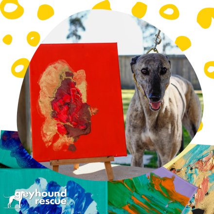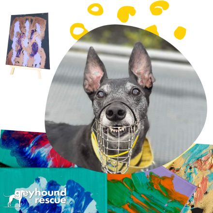 The "Greyt Masters" works are created by the "Kennel Kids" at Greyhound Rescue. These greyhounds have come to Greyhound Rescue from the racing industry and are being rehabilitated in order to start their new lives as adored family pets.