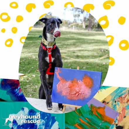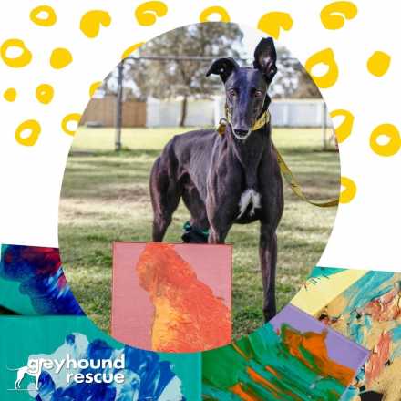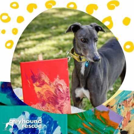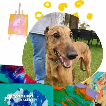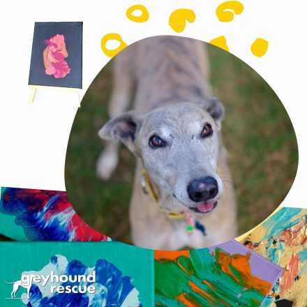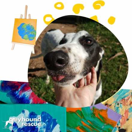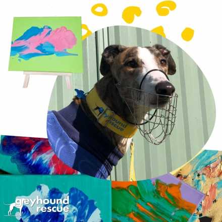The "Greyt Masters" works are created by the "Kennel Kids" at Greyhound Rescue. These greyhounds have come to Greyhound Rescue from the racing industry and are being rehabilitated in order to start their new lives as adored family pets.