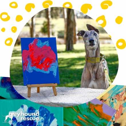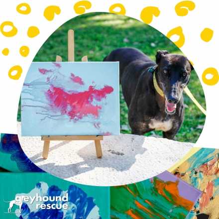 Greyhounds are invited to participate in creating artworks as a form of enrichment. Enrichment activities are excellent to help rescued hounds develop confidence and decision-making skills. Money raised from the sale of artworks assists with the high costs of rescuing, rehabilitation, and rehoming greyhounds.