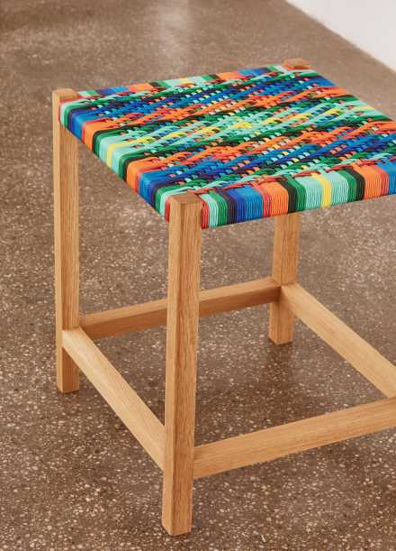 Description: This stool brings together sustainable material choices and traditional craft heritage in a contemporary form. The frame is made from durable white oak, and the seat is woven with recycled PET cord (RPET), a material chosen for its longevity and circular potential. By minimizing cord cutting, the design anticipates its own end-of-life cycle, allowing the cords to be more easily recovered and reused.
