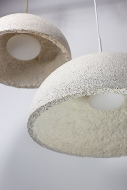 Description: The MushLume Hemi Pendant features a 23” diameter dome perfect for eco-conscious spaces. This sustainable hanging lamp offers a nature-inspired design that creates a lasting impression. The MushLume Lighting Collection consists of pendants, sconces, and table lamps and is grown using Ecovative's MycoComposite - a combination of mycelium and regionally sourced non-food agricultural waste. After the mycelium has fully matured, the lampshades are de-molded, dried, and heated, creating a 100% biodegradable lampshade. MycoComposite is naturally flame resistant and water resistant.