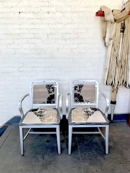 Description: The original aluminum navy chairs were created by the Electric Machine and Equipment Company (EMECO) for navy ships in 1944 during WW2. With the addition of simple upholstery, the aluminum chairs became suitable for office furniture. They were adorned with cutting edge materials of the day: vinyl cushion covers, polyurethane foam, cast synthetic rubber armrests, and a polyurethane sealer on the aluminum. We stripped away the deteriorating unhealthy foam and vinyl fabric and sandblasted the yellowed polyurethane surface from the aluminum frame and steel seat to reveal the natural color of the metals. Handknotted wool and silk rug samples saved from the waste stream were cut to follow the curves of each seat.
