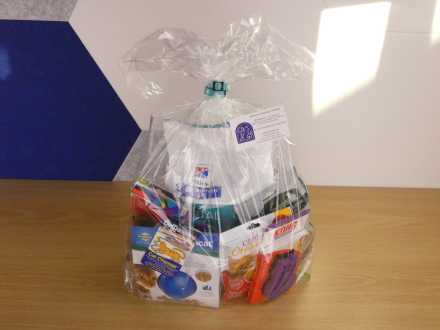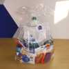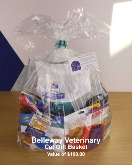This is a gift basket containing assorted cat toys, treats, and food generously donated by Belleway Veterinary worth $100.