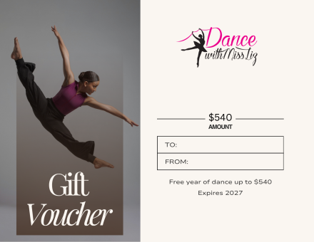This is a gift voucher for one year of dance classes from Dance with Miss Liz valued at $540. Must be used before 2027.