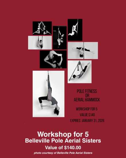 This is a pole fitness or aerial hammock workshop from Belleville Pole Aerial Sisters worth $140.