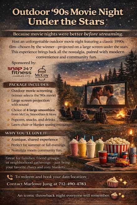 Host an unforgettable outdoor movie night featuring a classic 1990s film—chosen by the winner—projected on a large screen under the stars. This experience brings back all the nostalgia, paired with modern convenience and community fun.