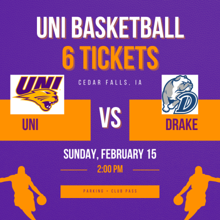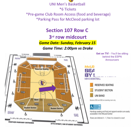 Experience college basketball like a true VIP with six premium seats to a UNI Men’s Basketball matchup against Drake, complete with exclusive perks that make this a standout game-day experience. You’ll enjoy 3rd-row midcourt seating in Section 107, Row C, placing you directly behind the ESPN announcers—yes, you might even find yourself on TV! Package Includes: 6 premium tickets (3rd row, midcourt – Section 107, Row C) Pre-game Club Room access with food and beverages Parking pass for the McLeod parking lot ESPN broadcast seating location (get on TV!) Game Details: Sunday, February 15 2:00 PM tip-off UNI vs Drake A must-have experience for Panther fans, alumni, or anyone looking for an unforgettable game day. Donated by Lisa and Scott Soifer