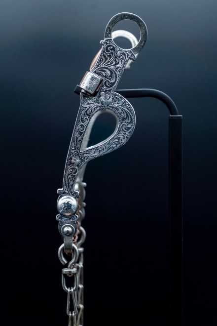 The bit includes its original rein chains, and the cheekpieces are stamped MONEL, confirming the steel type. The mouthpiece retains its authentic working wear, and the soft patina on the Monel and copper elements speaks to decades of careful use and preservation. This is not simply a bridle bit. It is a rare artifact representing foundational bloodlines, master horsemanship, and the evolution of high-level Western tack.