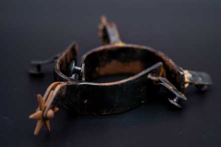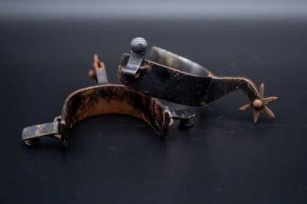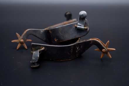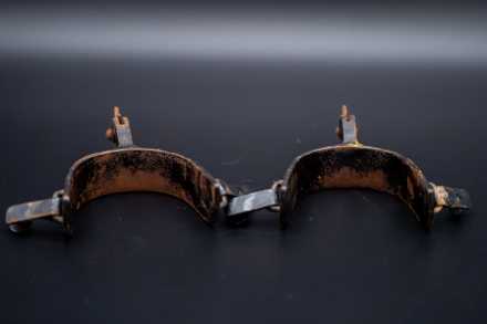 The body shows honest working wear, patina, and a darkened original finish, giving them an attractive, ranch-used character. Strap buttons are intact and functional. These are surprisingly heavy for their size, which adds to their stability on the boot and consistent feel on the horse.