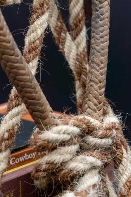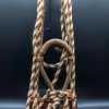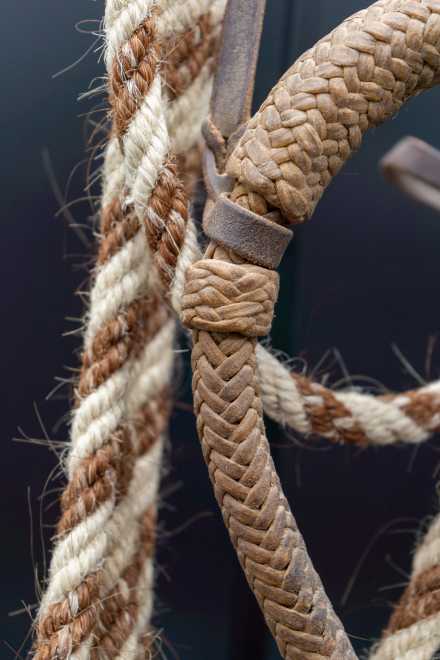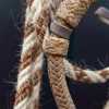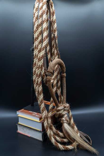 The mecate is a standout: a sorrel-and-white 5/8" four-strand rope braided in the 1990s. This pattern and size are not commonly associated with Krause’s production from that era, making it an interesting piece for collectors of mecates and California-style gear. The rope shows age and use but still maintains integrity, body, and a classic working-horse aesthetic.