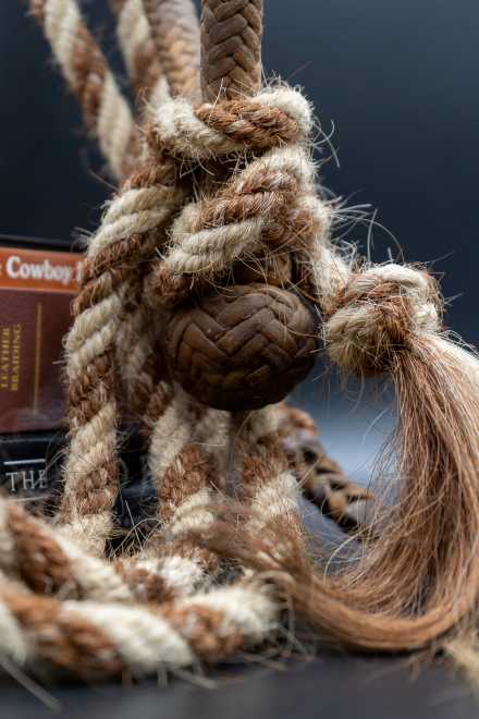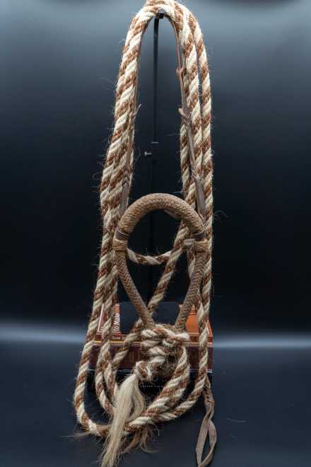 Overall, this is a practical, older hackamore setup: somewhat crude in finish, but functional, honest, and well suited to horses needing a mild feel. The rawhide bosal has a supportive flex, consistent shape, and a solid heel knot, while the mecate adds both collectible interest and working value.
