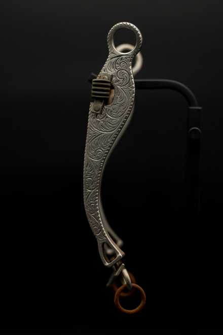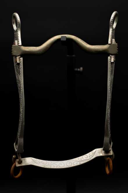 The low-port mouthpiece offers mild palate pressure with abundant tongue room, making it a versatile choice for finished horses needing subtle lift and collection rather than leverage or correction. The shanks are fully engraved in a traditional scroll pattern, adding formality without sacrificing weight balance. Even with visible age and honest use, the detail remains sharp and the bit’s geometry is true.