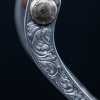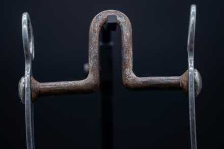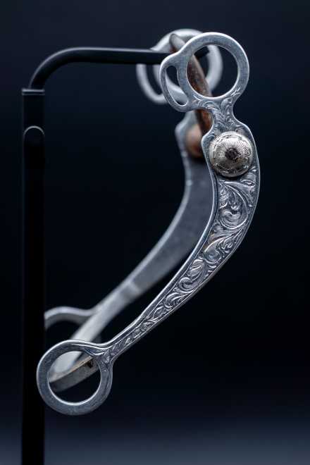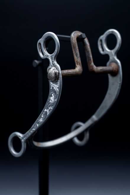 The bit is a copy of the original “grazer” style shank, but modified in Jim’s shop. During that period, Jim welded the aluminum slobber bar into place to help stabilize the shanks and prevent flexing under pressure.