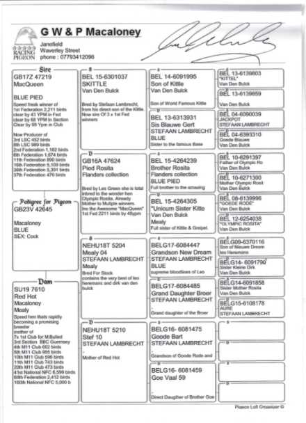 'Hot-Speed Queen' - GB23V42645 - Blue Pied Hen is an outstanding hen direct from GWP Macaloney. She is a truly special direct daughter of Macqueen