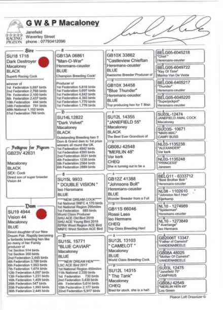 Top Federation winning cock , direct son of the Awesome MANOWAR, one of the best breeders the partnership ever had from their late friend Thomas Blair. Dark Destroyer is a prize winner out to 347 miles and retired in 2021 , the partnership feel they haven’t done him the justice as he deserves as of yet in the breeding loft down to a missed breeding year of broken eggs and fighting. But with winning genetic like these and the fact 3 of his full siblings have top federation and went on to bred winners , the future is bright for the Dark destroyer
