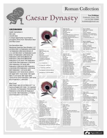 Blue Demolition X - GB25B69009 - Blue cock - A truly wonderful pigeon, simply pure class of the highest level, this youngster is direct from ’The Demolition Man’ when paired with Champion 'Blue Caviar’
