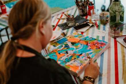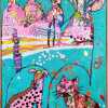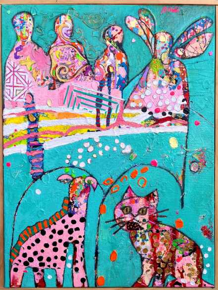 ‘Spirit Guides’ is a vibrant and whimsical original artwork by Bohdi Taylor, bursting with colour, symbolism, and layered storytelling. Set against a luminous turquoise ground, playful animal figures and abstracted characters emerge in bold pinks, citrus tones, and intricate decorative patterning.