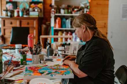 Using acrylic and charcoal, Taylor builds energy through intuitive mark-making, splashes of colour, and expressive line. The composition feels playful yet meaningful — a reminder that words can heal, inspire, and transform.