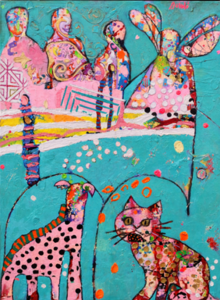 ‘Spirit Guides’ is a vibrant and whimsical artwork by Bohdi Taylor, bursting with colour, symbolism, and layered storytelling. Set against a luminous turquoise ground, playful animal figures and abstracted characters emerge in bold pinks, citrus tones, and intricate decorative patterning.