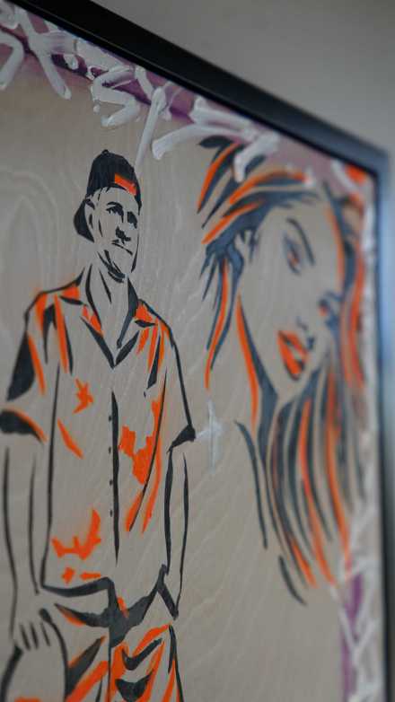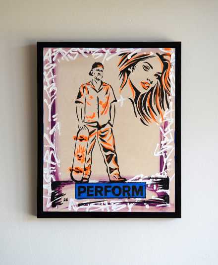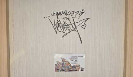 A bold and highly resolved work, Ashby’s ‘Human Capital’ exemplifies the artist’s distinctive fusion of graphic immediacy and painterly gesture. Executed in layered oil and acrylic on timber, the work carries both physical presence and conceptual clarity — balancing raw mark-making with a controlled, contemporary visual language.