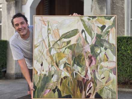 ‘In the Midst’ immerses the viewer in a dense tapestry of foliage and organic forms, where sweeping brushwork, expressive lines and rich botanical tones evoke the feeling of standing within the heart of the landscape itself.