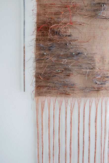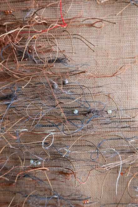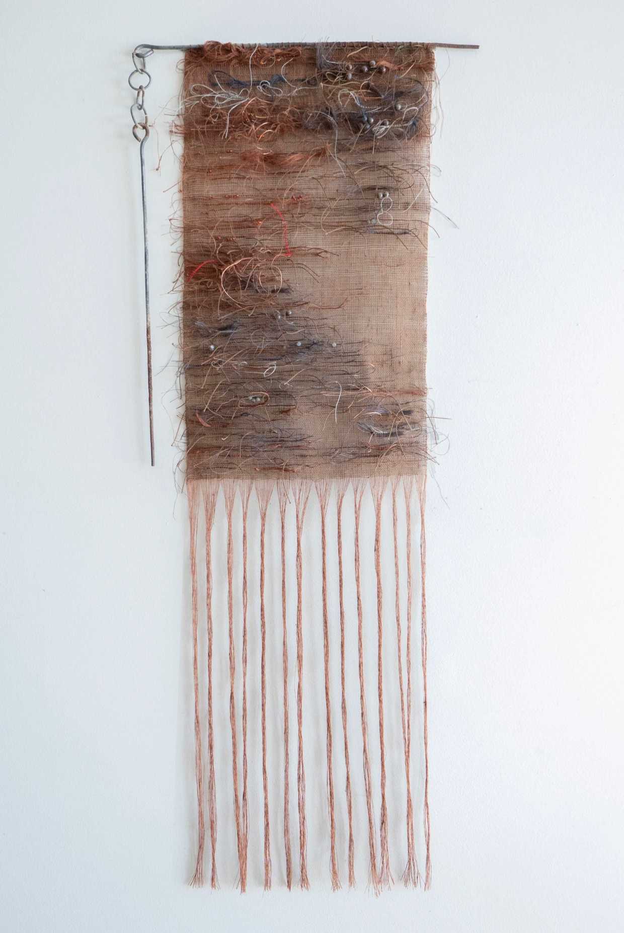 Working with raw linen, gathered fibres, stone beads and fragments of discarded thread, Claudia May Bloxsome creates an artwork that feels both elemental and intimate. Wisps of fibre drift across the surface like reeds along a riverbank, while subtle metallic threads and copper accents catch the light with shifting intensity. The hand-finished fringe at the base introduces a gentle sense of downward flow — echoing current and gravity.