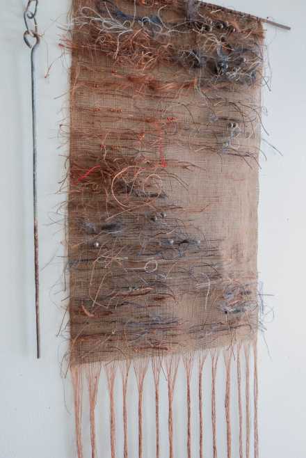 Linen, Stone Beads, Metal, Copper, Discarded Thread (installed on a metal rod)