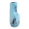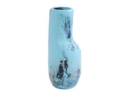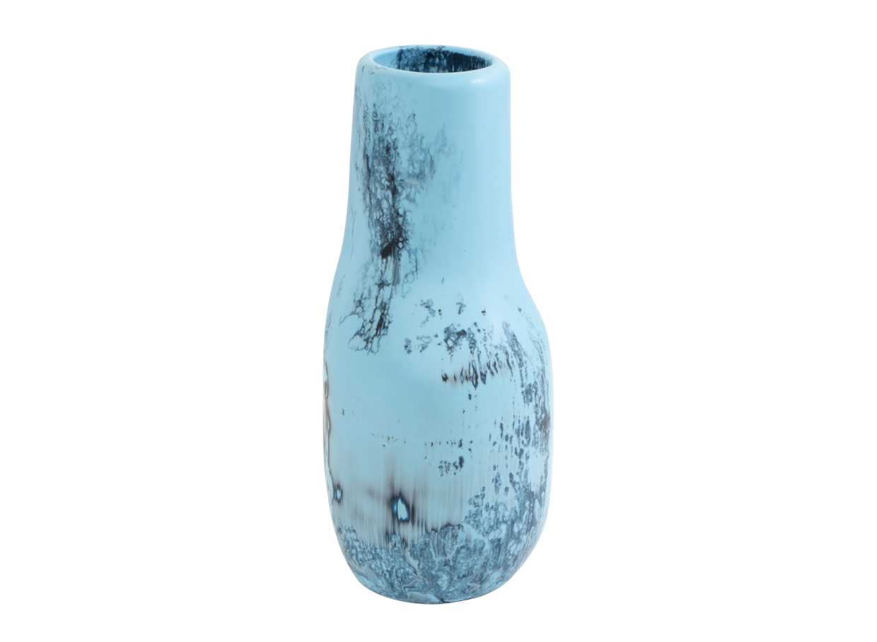 The surface features a soft aqua base layered with inky, tidal washes of deep blue and charcoal, evoking movement, depth and the shifting tones of water. This interplay of colour and form gives the vase a sense of calm dynamism, equally suited to contemporary interiors or collector display.