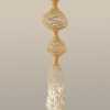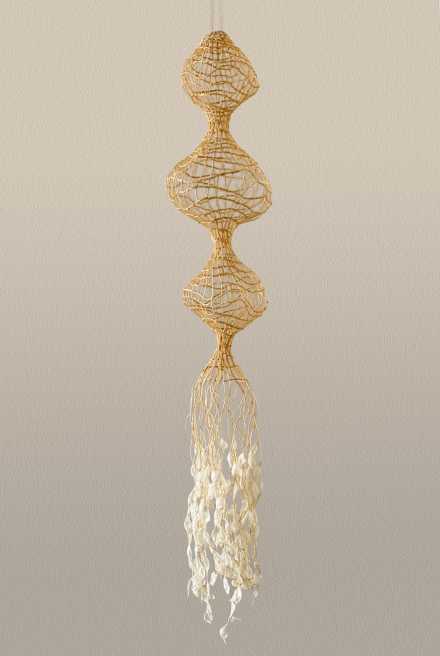 Its sculptural silhouette flows through a series of bulbous, cinched forms, culminating in delicate teardrop strands that have been individually unraveled by hand. The piece gently responds to its environment, shifting with air and light.