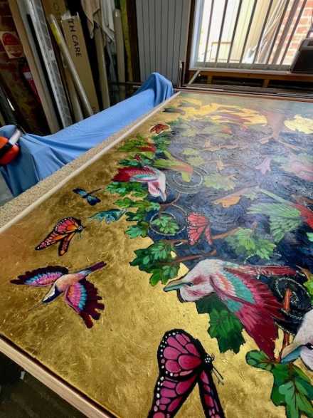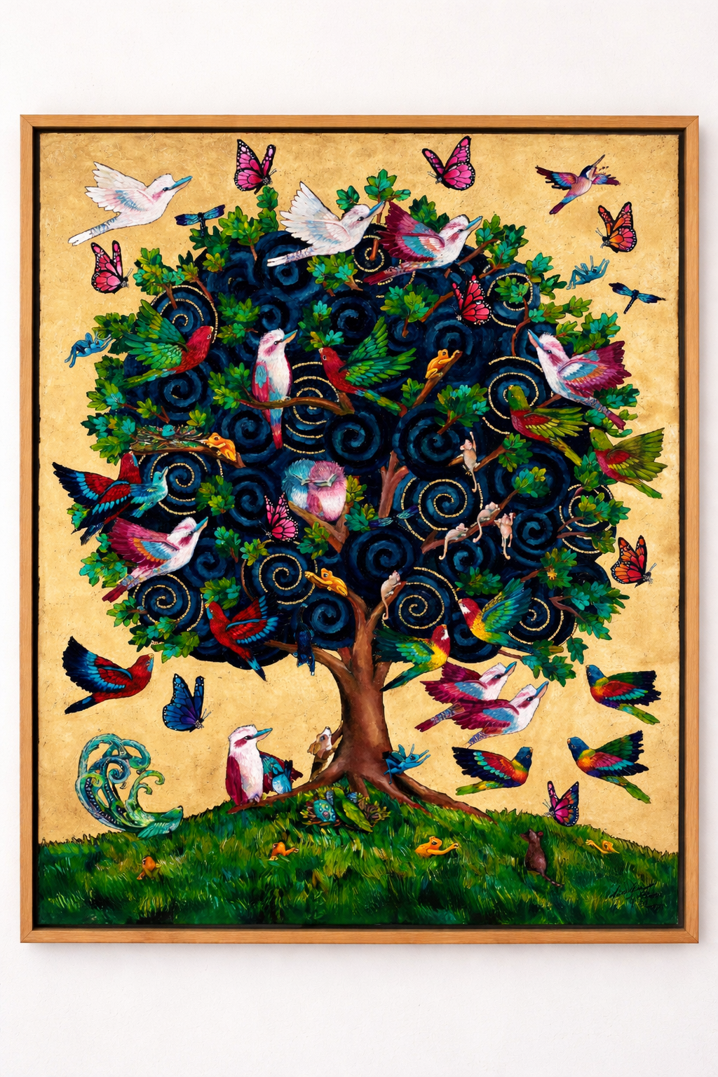 Rich with her distinctive symbolic vocabulary, the tree becomes a living sanctuary — a place of refuge, remembrance and renewal. Each bird suggests a spirit, each swirl a memory, each vibrant creature a continuation of life. Set against luminous gold detailing and housed within a floating frame gilded in 24-carat gold, the work radiates warmth and reverence.