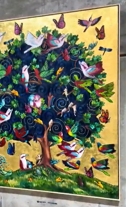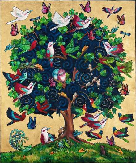 Through nature’s language, Kennedy transforms grief into beauty, weaving life, loss and connection into a radiant tree bursting with birds, butterflies and hidden stories.