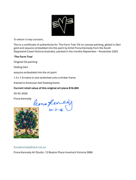 At 1.5 x 1.8 metres,’ The Farm Tree’ is not simply a painting — it is a centrepiece. A statement work that carries profound emotional weight and extraordinary visual impact.