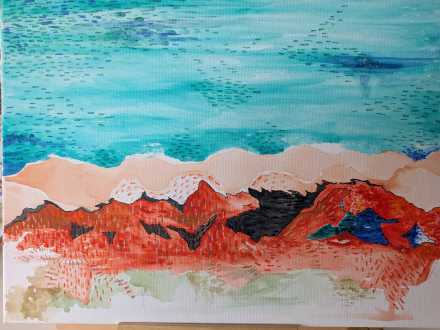 Loose mark-making and delicate line work create a sense of movement across the surface, suggesting shifting landscapes where sea, sand and desert converge. The work balances airy washes of colour with graphic forms, giving the piece a contemporary, illustrative quality.