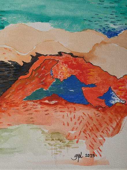 ‘Ocean Meets Outback’ by Gillian Page-Lee explores the meeting point between Australia’s vivid coastline and the warm tones of the inland landscape. Painted in layered gouache washes, the composition contrasts cool turquoise waters with the rich reds and ochres of the outback terrain.