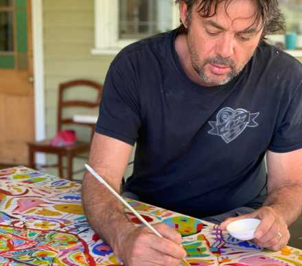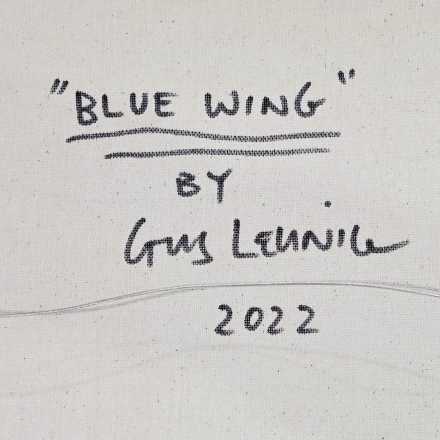 Intricately layered, ‘Blue Wing’ draws the viewer into a dense, rhythmic landscape of colour, pattern, and form. Leunig’s distinctive visual language—marked by organic shapes, dotted pathways, and interwoven figures—creates a dynamic composition that feels both intuitive and deeply structured.