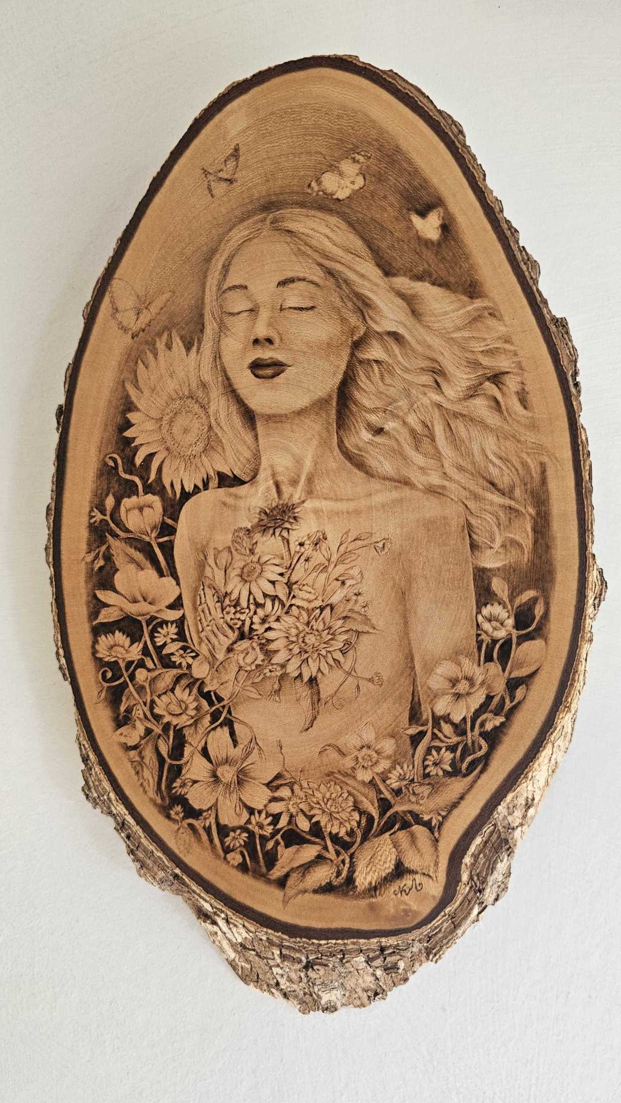 With flowing hair carried on unseen currents and native florals blooming from the heart space, the artwork speaks to resilience, renewal and harmony with the natural world. Butterflies and detailed botanical forms emerge through careful tonal burning — each mark created by hand, without the use of laser technology — honouring the slow, deliberate craft of pyrography.