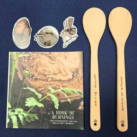 - A Book Of Burnings by Kellie May Mannix - a 20cm x 20cm softcover book showcasing pyrography art, intricate designs and creativity (RRP $15).