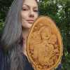 ‘The Garden of Soul’ is an intricately hand-burned pyrography work by Kellie May Mannix, created over 25 meticulous hours using traditional freehand techniques. Etched into reclaimed invasive Jacaranda timber, the piece brings together portraiture and botanical symbolism in a meditation on growth, healing and inner connection.
