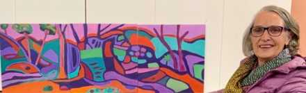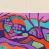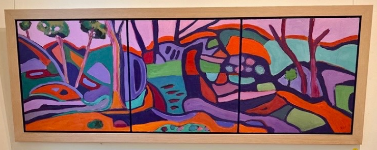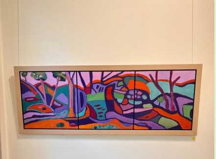 McCauley’s distinctive visual language transforms the natural environment into a dynamic composition of colour and line—echoing the contours of ancient landforms while celebrating the energy and movement of the Australian landscape. Rich ochres, vivid greens and electric purples interplay across the panels, creating a sense of both harmony and vitality.