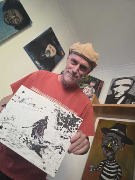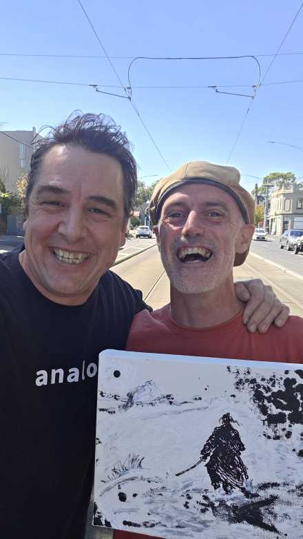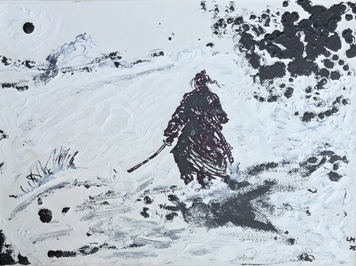 ‘Bushido Bill’ is an original acrylic painting by Australian artist Lee Mason, whose work is known for its bold characters and expressive, instinctive mark-making. This piece carries a striking emotional undercurrent — born from a period of severe chronic pain, as Mason lives with Crohn’s disease. The work becomes not just an image, but an embodiment of endurance, resilience and internal battle.