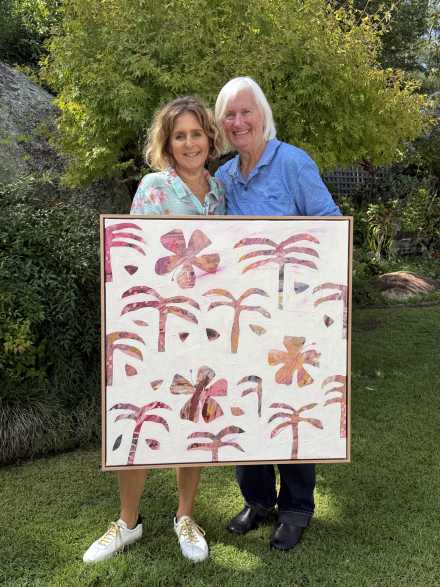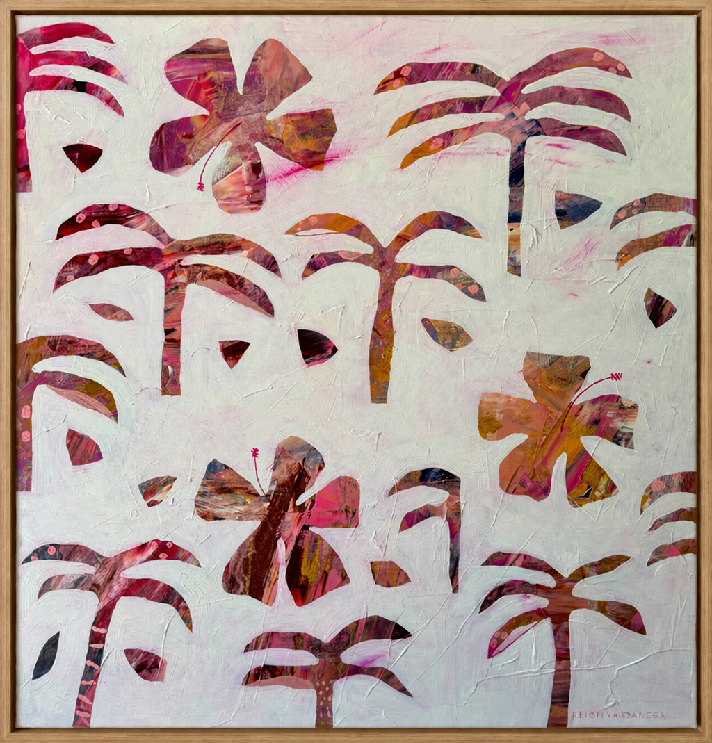 Bursting with warmth, movement and layered texture, ‘Hibiscus Crush’ by Leigh Vardanega is a joyful celebration of colour and place. Inspired by coastal flora and sun-drenched landscapes, the work features a rhythmic scattering of abstracted hibiscus forms—each emerging through soft, chalky whites to reveal vibrant layers of pink, coral and earthy undertones beneath.