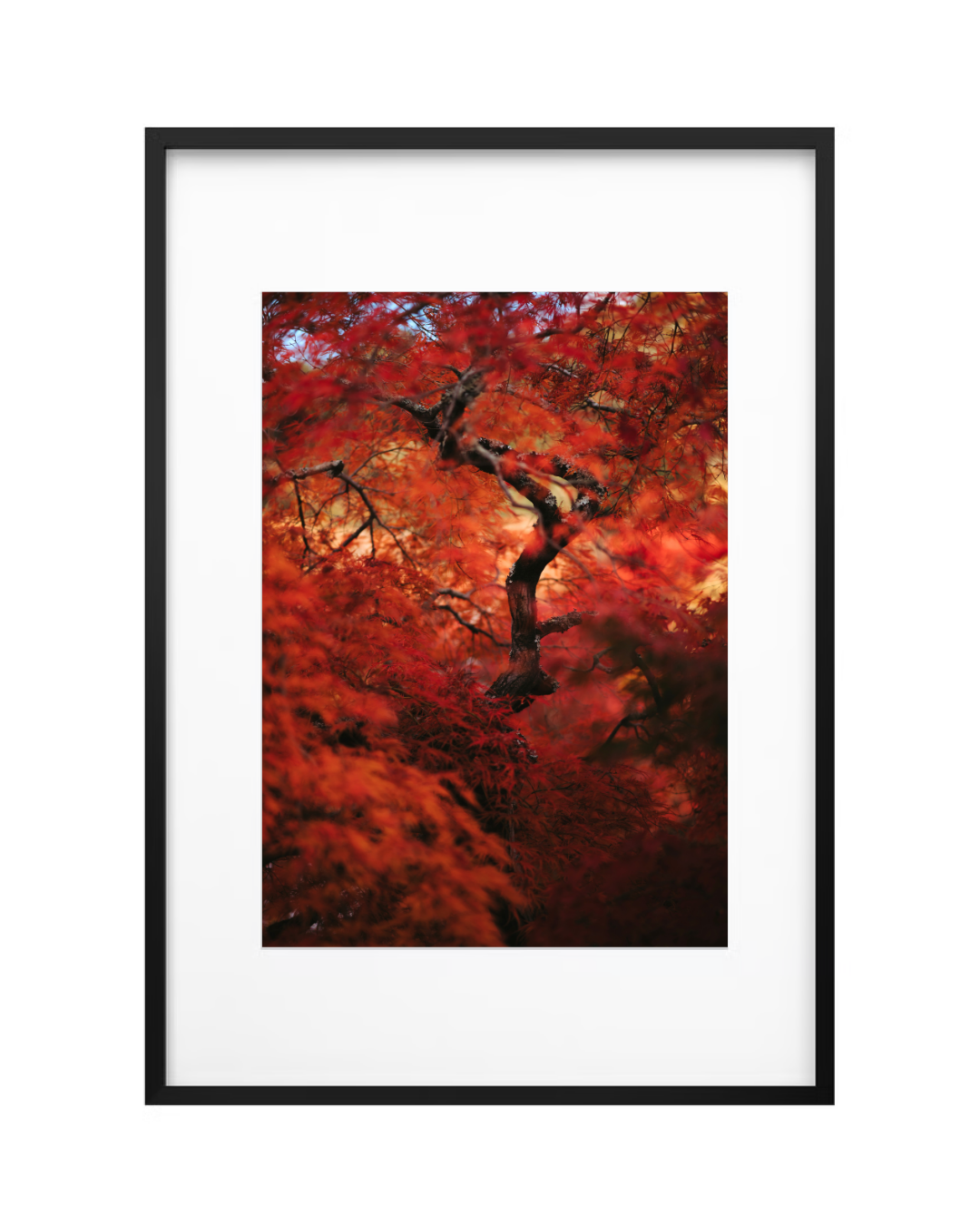 ‘Momiji’ by Lisa Knight is a richly evocative framed photograph inspired by the Japanese appreciation of impermanence and change. In Japanese culture, maple leaves (momiji) are cherished not despite their transformation, but because of it—and this work captures that fleeting beauty with quiet intensity.
