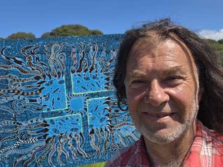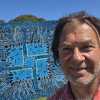 Krueger builds a rhythmic, almost meditative surface where each mark contributes to a greater whole. The vibrant blue palette is both striking and immersive, guiding the eye across a tapestry of movement, energy and storytelling. There is a sense of community embedded within the work.