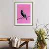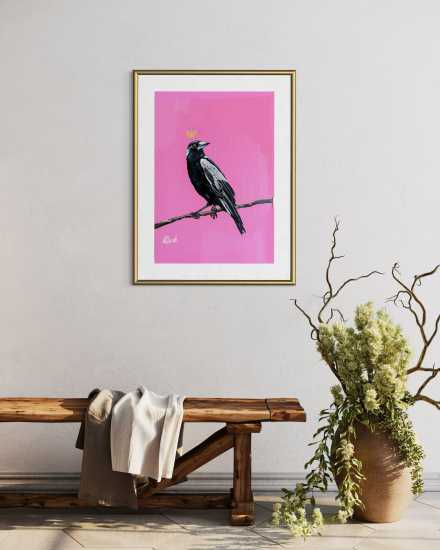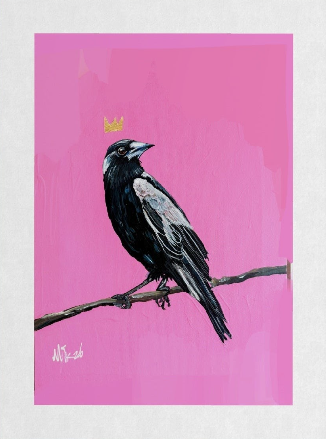 ‘She Rests’ captures a quiet, grounded moment—a magpie perched in stillness against a field of vivid pink, Shellbee’s favourite colour. Crowned in gold, she is honoured as “angel queen,” a symbol of enduring love that transcends physical presence. The composition evokes calm, reflection and the gentle feeling of being watched over.