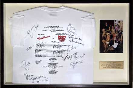 The piece features the original event tee-shirt signed by members of the Neighbours cast, including Natalie Bassingthwaighte, Terence Donovan, Alan Fletcher, Maria Mercedes, Bernard Curry, Brett Swain, Marcella Russo, Marisa Warrington, Blair McDonough, Natalie Blair and Ben Nichols. The display also includes a cast photograph and commemorative plaque (Regent Theatre on November 20, 2004).