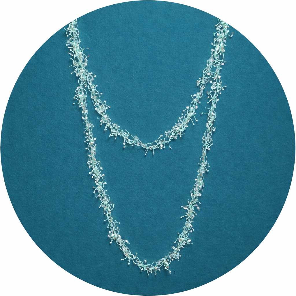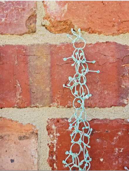 Hand-formed from reclaimed vintage Telecom wire, the chain flows in an organic network of looping forms that evoke tiny drifting jellyfish. Its soft tones (mint) create a light, sculptural presence, allowing the piece to sit beautifully as both jewellery and contemporary art. Designed with versatility in mind, it can be worn as a single long strand or doubled for a layered look.