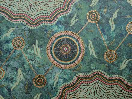 ‘Bush Medicine’ honours the healing power of Country and the sacred knowledge passed down through generations. Rich greens and luminous golds symbolise native plants used in traditional remedies, while interconnected circles represent gathering places where stories, wisdom and cultural practice are shared. Flowing leaf forms speak to renewal, vitality and the enduring relationship between land, health and community.
