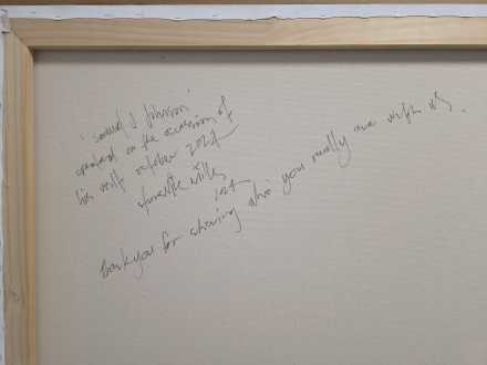 The painting carries exceptional provenance, with a handwritten inscription on the verso by the artist, recording its creation in October 2024 on the occasion of Johnson speaking at Mills’ exhibition opening. This direct link between artist and subject elevates the work beyond portraiture, situating it as a documented moment of cultural and personal exchange.