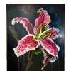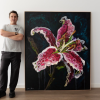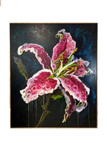Set against a dramatic, inky backdrop, layers of expressive brushwork and impasto create movement, depth and intensity. The bloom appears almost sculptural — alive, generous and unapologetically bold.