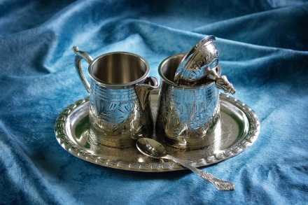 The very finest silvered-copper tea set to be found in the old Jbeil souk. It features delicate engraving of Lebanese floral patterns. This piece just shines!